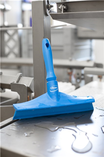 Higieniczna ściągaczka z elastycznym pojedynczym piórem. Wykonana z jednego kawałka, brak krawędzi do gromadzenia zanieczyszczeń. Odpowiednia do usuwania nadmiaru wody i odpadów przy produkcji spożywczej. Z mini stylem w komplecie.