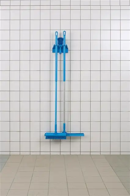 Wieszak ścienny służący do przechowywania sprzętu czyszczącego. Wykonany z polipropylenu z gumowymi krawędziami chwytnymi, dla trzech narzędzi.